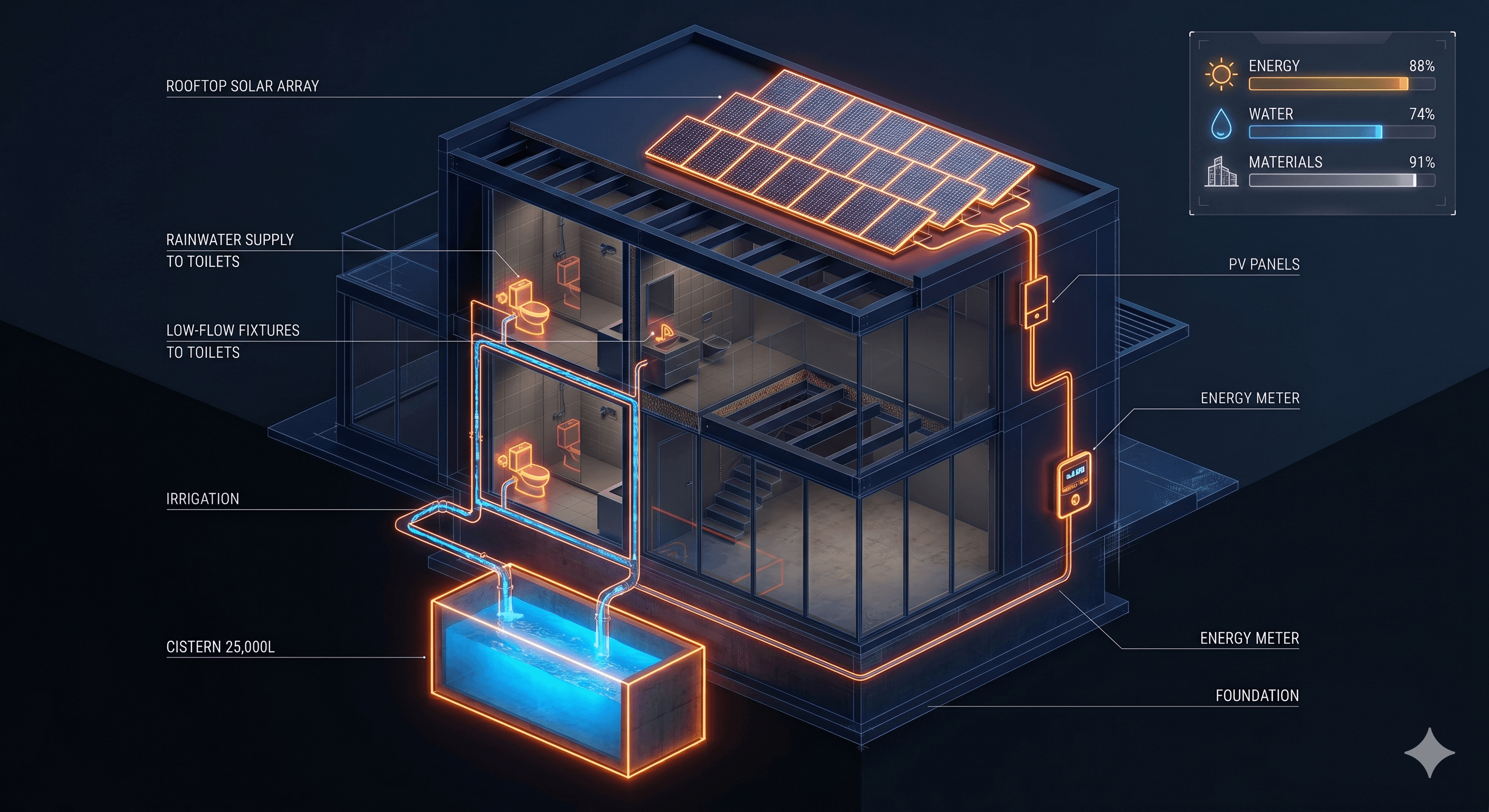 A captação de água da chuva é especialmente relevante para a certificação EDGE no Brasil, dado o regime pluviométrico favorável da maior parte do território nacional. Um sistema de cisterna bem dimensionado, integrado a um filtro pluvial de alta eficiência, pode contribuir de forma significativa para atingir a meta de redução hídrica do eixo.