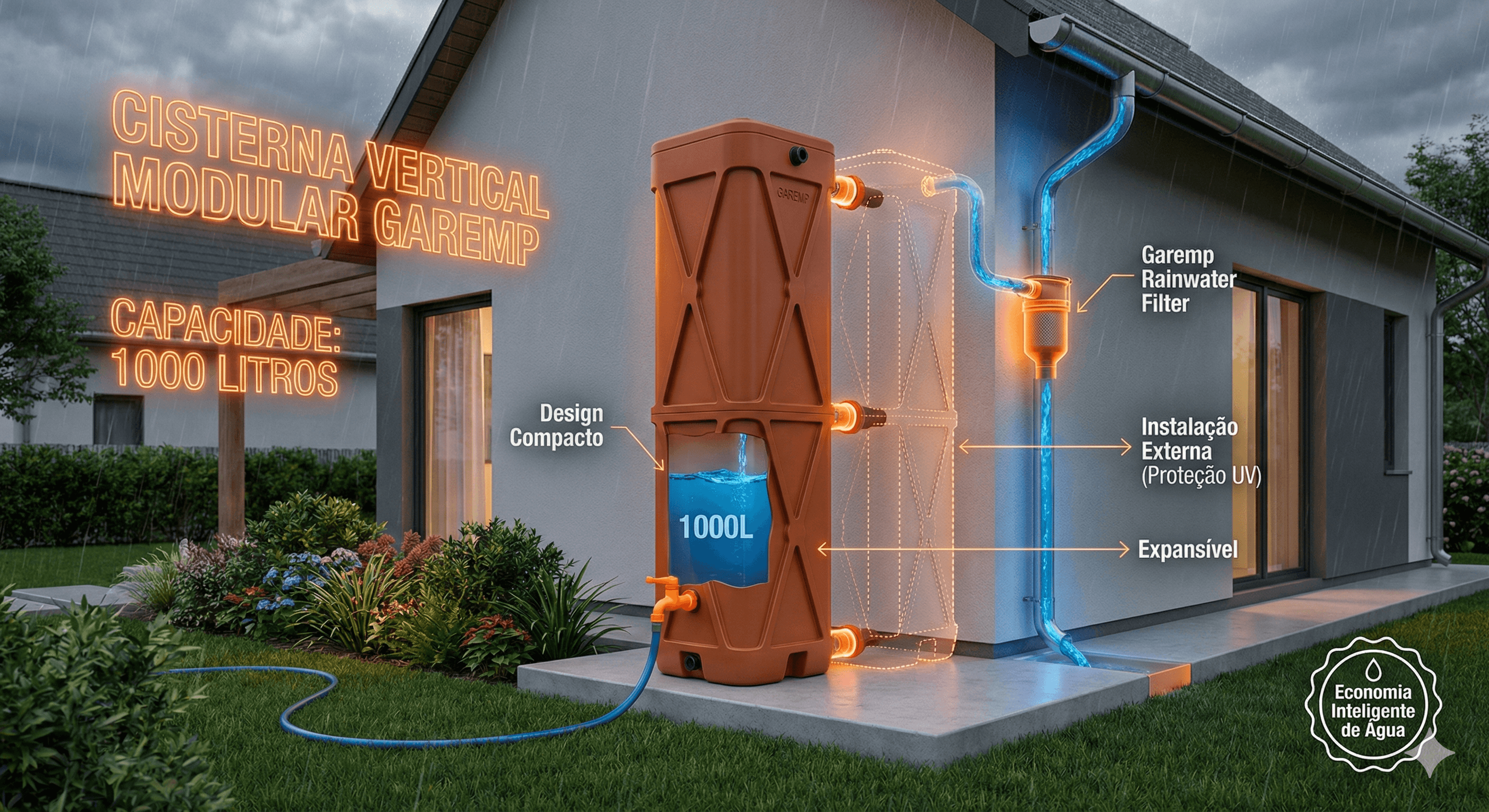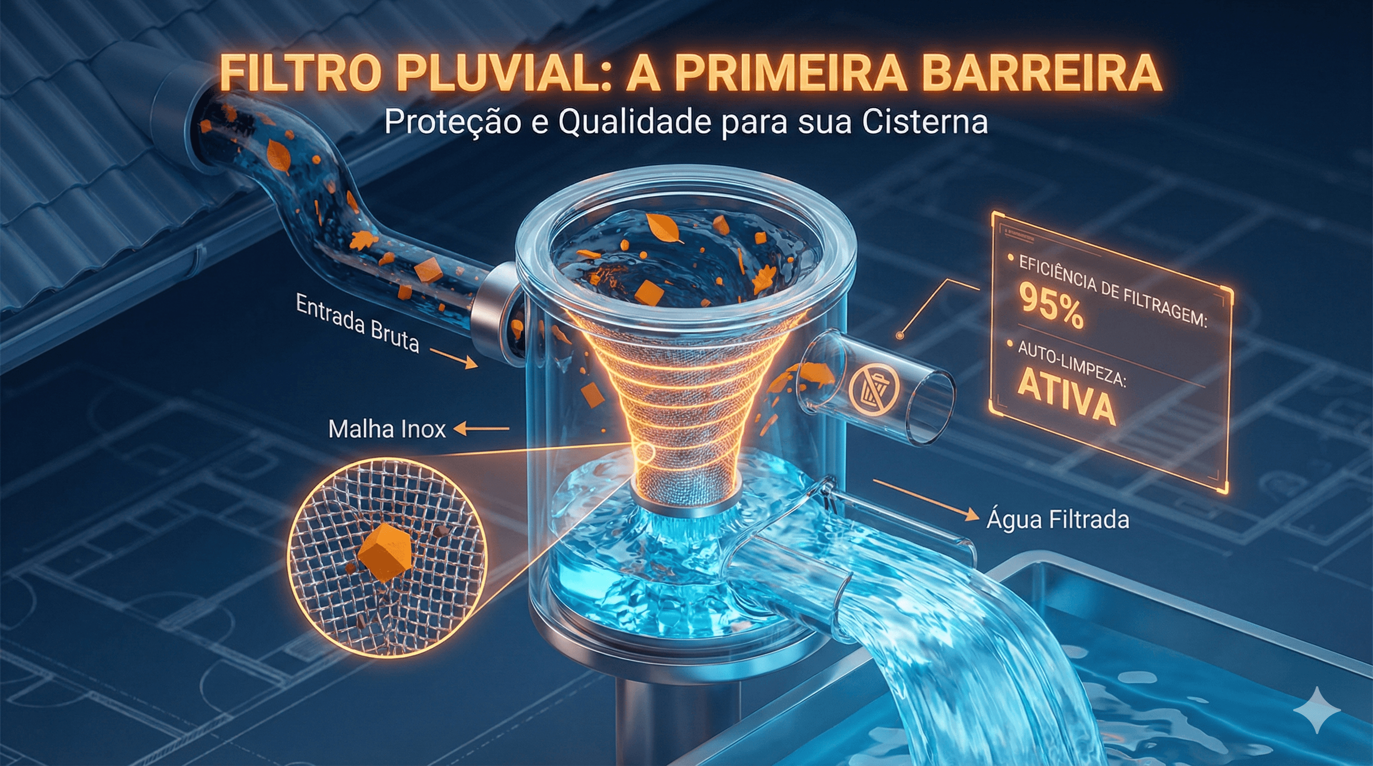 O filtro pluvial não funciona isolado. Ele é parte de um sistema integrado de captação de água da chuva que precisa funcionar em harmonia para entregar eficiência.