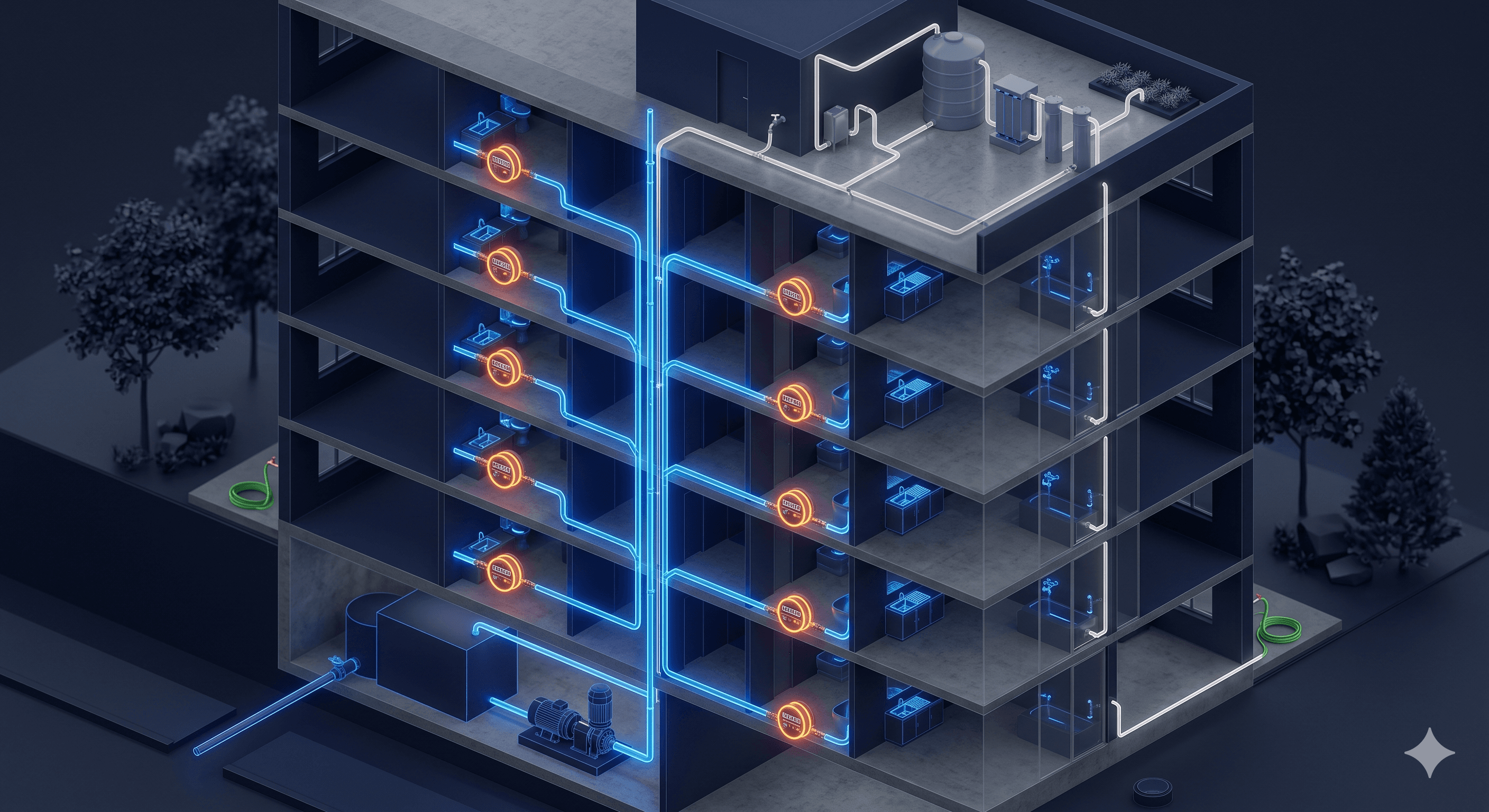 A decisão de implantação em edifícios existentes exige avaliação do projeto hidráulico original para verificar se os ramais comportam a instalação de hidrômetros individuais sem obras de grande porte, além de aprovação em assembleia condominial.